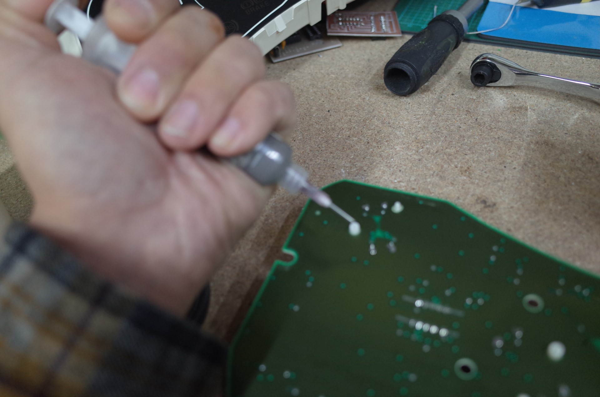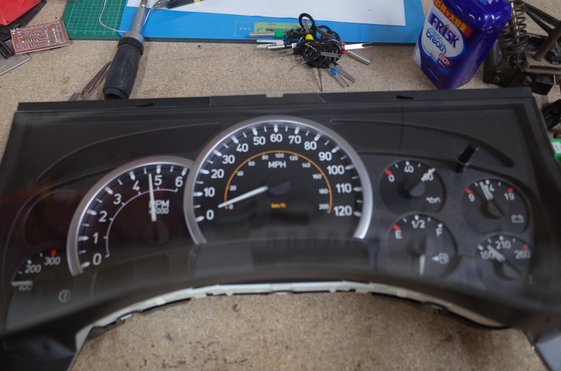 このメーターは基盤のパターンが非常に細く損壊しやすいので慎重に交換を行う必要があります。